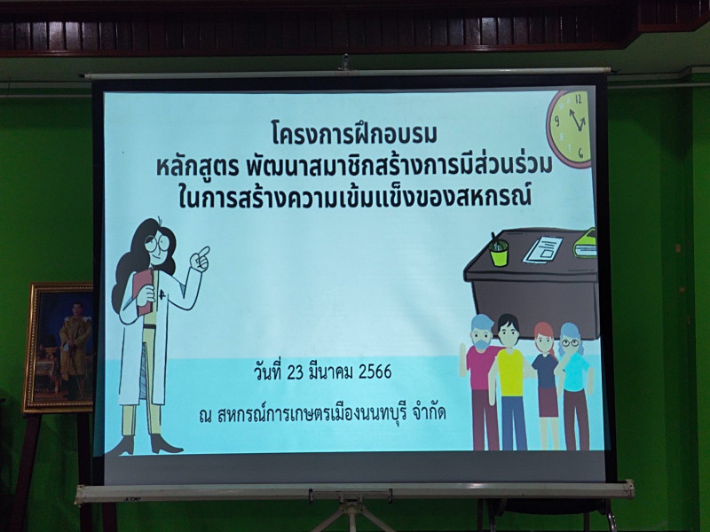 วันพฤหัสบดี ที่ 23 มีนาคม 2566 เวลา 09.00 นายรุ่งโรจน์ สรวุฒิพิบูลย์ สหกรณ์จังหวัดนนทบุรี เป็นประธานในพิธีเปิด โครงการฝึกอบรม หลักสูตร พัฒนาสมาชิกสร้างการมีส่วนร่วมในการสร้างความเข็มแข็งของสหกรณ์การเกษตรเมืองนนทบุรี จำกัด จัดโดยศูนย์ถ่ายทอดเทคโนโลยีการสหกรณ์ที่ 1 จังหวัดปทุมธานี และมีนายศิริพจน์ ทองนวล ผู้อำนวยการกลุ่มส่งเสริมสหกรณ์ 1 ร่วมสังเกตการณ์ ณ ห้องประชุมชั้น 2 สหกรณ์การเกษตรเมืองนนทบุรี จำกัด อำเภอเมืองนนทบุรี จังหวัดนนทบุรี