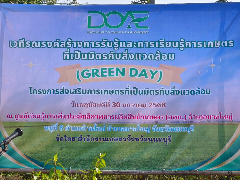 เข้าร่วมงานเวทีรณรงค์สร้างการรับรู้และการเรียนรู้การเกษตรที่เป็นมิตรกับสิ่งแวดล้อม (Green Day) โดยในงานมีการจัดนิทรรศการการจัดการและใช้ประโยชน์จากเศษวัสดุเหลือใช้ทางการเกษตรและเทคโนโลยีการเกษตรที่เป็นมิตรกับสิ่งแวดล้อม โดยมีนายเกียรติศักดิ์ ตรงศิริ ผู้ว่าราชการจังหวัดนนทบุรี เป็นประธานในพิธี