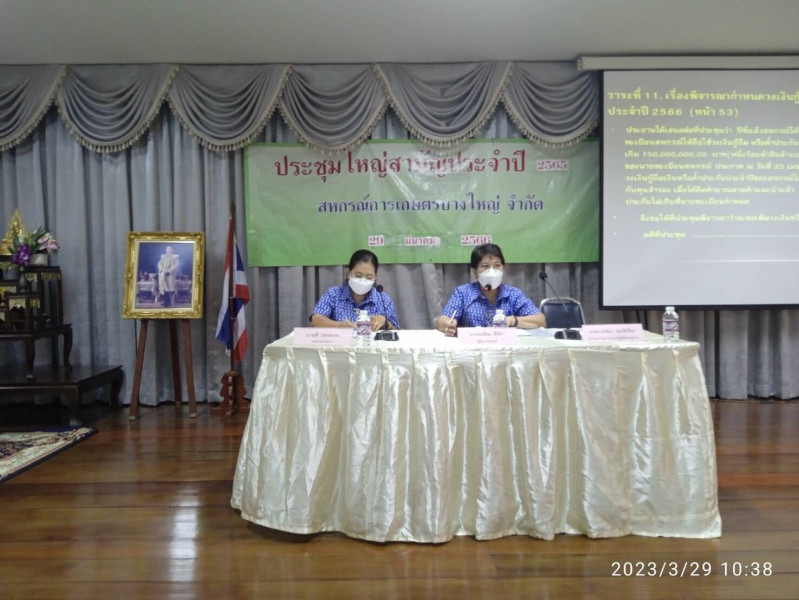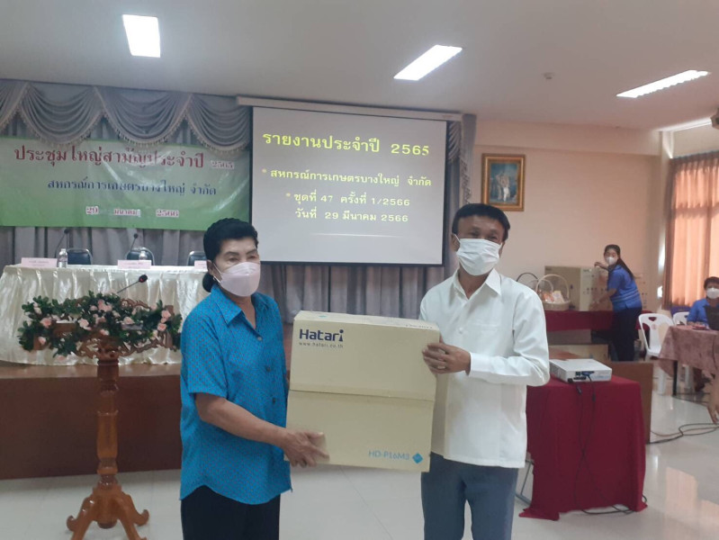 วันพุธที่ 29 มีนาคม 2566 เวลา 09.00 น. สหกรณ์จังหวัดนนทบุรี มอบหมายให้นายอภิเศรษฐ์ บูรณ์ชนะ ผอ.กลุ่มส่งเสริมและพัฒนาธุรกิจสหกรณ์,น.ส.ศศลักษณ์ มณีนิล ผอ.กลุ่มส่งเสริมสหกรณ์ 2 และคณะ เข้าร่วมประชุมใหญ่สามัญประจำปี 2565 ของสหกรณ์การเกษตรบางใหญ่ จำกัด โดยมีผู้แทนสมาชิกสหกรณ์เข้าประชุม 130 คน และได้แนะนำในการประชุมฯ ให้เป็นไปตามข้อบังคับของสหกรณ์ และกฎหมายที่เกี่ยวข้อง ซึ่งสหกรณ์มีผลการดำเนินงาน คือ
