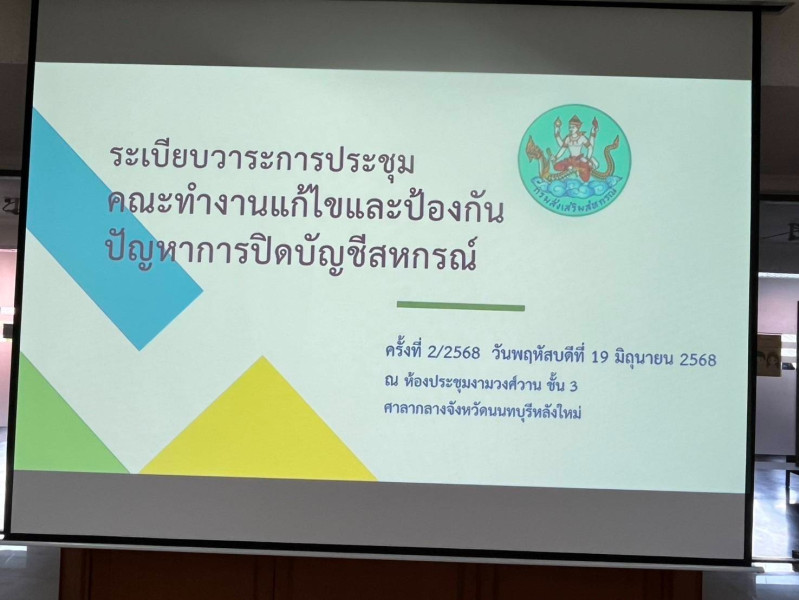 >> วันพฤหัสบดีที่ 19 มิถุนายน 2568 เวลา 10.30 น. นางปฐมพร สุทธนากร สหกรณ์จังหวัดนนทบุรี เป็นประธานในการประชุมคณะทำงานแก้ไขและป้องกันปัญหาการปิดบัญชี ครั้งที่ 2/2568 เพื่อติดตามการแก้ไขและป้องกันปัญหาการปิดบัญชีของสหกรณ์ โดยมีคณะทำงานฯ ซึ่งประกอบไปด้วยผู้แทนสำนักงานตรวจบัญชีสหกรณ์นนทบุรี ผู้แทนสถาบันพัฒนาองค์กรชุมชน (องค์การมหาชน) ผู้แทนเครือข่ายบ้านมั่นคงภาคกรุงเทพฯ ปริมณฑลและตะวันออก และบุคลากรของสำนักงานสหกรณ์จังหวัดนนทบุรีเข้าร่วมประชุม