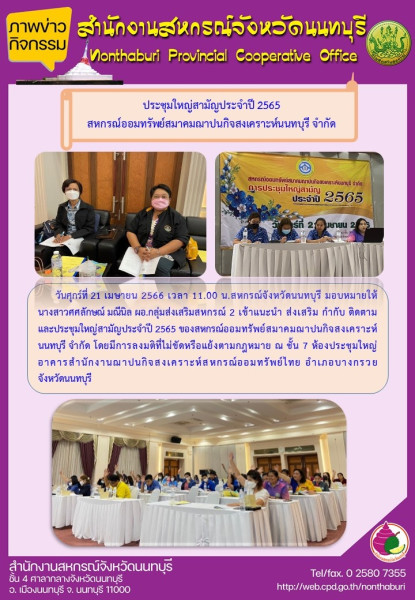 วันศุกร์ที่ 21 เมษายน 2566 เวลา 11.00 น.สหกรณ์จังหวัดนนทบุรีมอบหมายให้นางสาวศศลักษณ์ มณีนิล ผอ.กลุ่มส่งเสริมสหกรณ์ 2 เข้าแนะนำ ส่งเสริม กำกับ ติดตาม และประชุมใหญ่สามัญประจำปี 2565 ของสหกรณ์ออมทรัพย์สมาคมฌาปนกิจสงเคราะห์นนทบุรี จำกัด โดยมีการลงมติที่ไม่ขัดหรือแย้งตามกฎหมาย ณ ชั้น 7 ห้องประชุมใหญ่อาคารสำนักงานฌาปนกิจสงเคราะห์สหกรณ์ออมทรัพย์ไทยอำเภอบางกรวย จังหวัดนนทบุรี