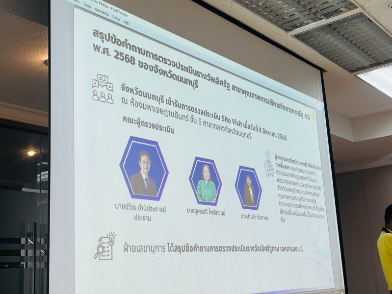 เข้าร่วมประชุมถอดบทเรียนการชี้แจงการตรวจประเมินเพื่อยืนยันผลการประเมิน ณ สถานที่ปฏิบัติงาน (Site Visit) โดยมีนายเกียรติศักดิ์ ตรงศิริ ผู้ว่าราชการจังหวัดนนทบุรี เป็นประธานการประชุม