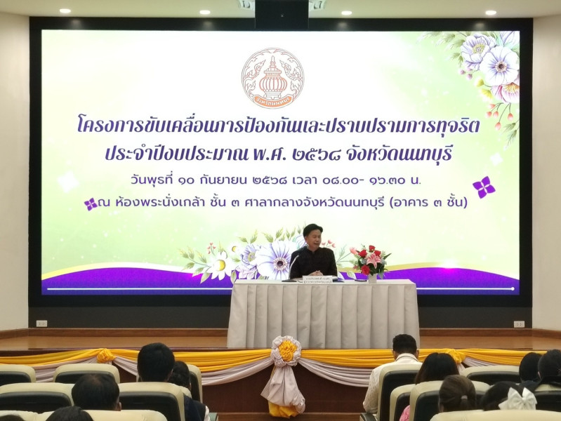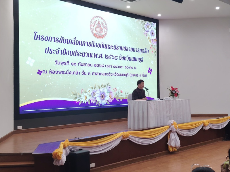 ประโยชน์ส่วนตัวและผลประโยชน์ส่วนรวม ประเภทของผลประโยชน์ทับซ้อน การแจ้งแบะแส ร้องเรียนแก่สำนักงาน ป.ป.ช. โดยมีนายเกียรติศักดิ์ ตรงศิริ ผู้ว่าราชการจังหวัดนนทบุรี เป็นประธานเปิดโครงการ