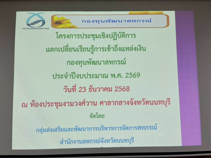 วันอังคารที่ 23 ธันวาคม 2568 เวลา 09.00 น. สหกรณ์จังหวัดนนทบุรีมอบหมายให้นายอภิเศรษฐ์ บูรณ์ชนะ ผู้อำนวยการกลุ่มส่งเสริมและพัฒนาการบริหารการจัดการสหกรณ์ เป็นประธานในพิธีเปิดและบรรยาย “โครงการประชุมเชิงปฏิบัติการแลกเปลี่ยนเรียนรู้การเข้าถึงแหล่งเงินกองทุนพัฒนาสหกรณ์ ประจำปีงบประมาณ พ.ศ. 2569" จัดโดยกลุ่มส่งเสริมและพัฒนาการบริหารการจัดการสหกรณ์ กลุ่มเป้าหมายจำนวน 21 คน ประกอบด้วยผู้แทนสหกรณ์ที่กู้และประสงค์จะกู้เงินกองทุนพัฒนาสหกรณ์ เจ้าหน้าที่กลุ่มงานและกลุ่มส่งเสริมสหกรณ์ สำนักงานสหกรณ์จังหวัดนนทบุรี
