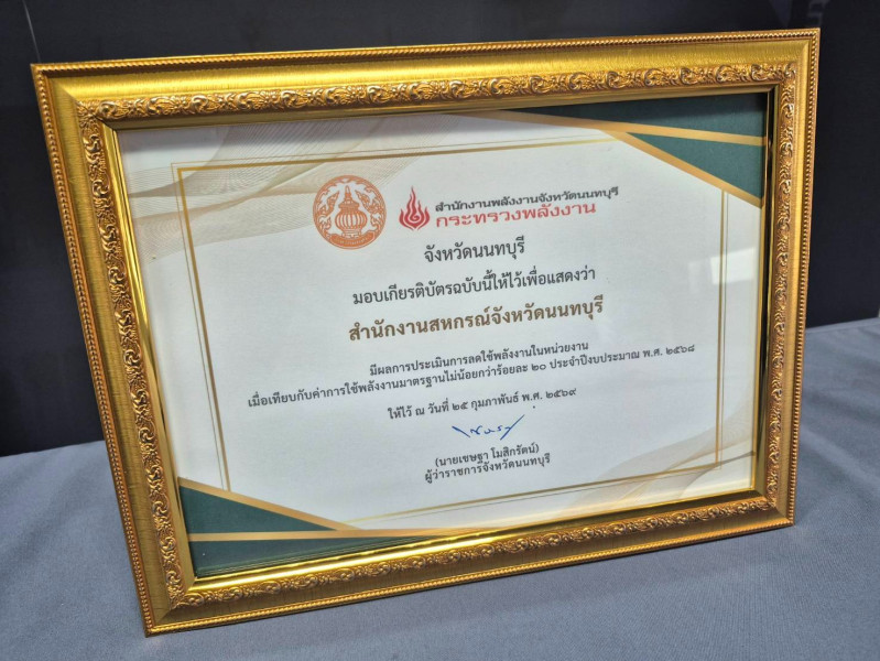 รับมอบเกียรติบัตรเชิดชูเกียรติ ที่สำนักงานสหกรณ์จังหวัดนนทบุรีเป็นหน่วยงานที่มีผลการลดใช้พลังงานไม่น้อยกว่าร้อยละ 20 ประจำปีงบประมาณ พ.ศ. 2568 ในการสัมมนา "Smart Energy Government : แนวทางการอนุรักษ์พลังงานและการรายงานผลผ่าน e- Report" ภายใต้โครงการส่งเสริมการลดใช้พลังงานในภาครัฐ ประจำปีงบประมาณ พ.ศ. 2569 โดยมีนายอภิชัย อร่ามศรี รองผู้ว่าราชการจังหวัดนนทบุรี เป็นประธานเปิดการสัมมนาและมอบเกียรติบัตร