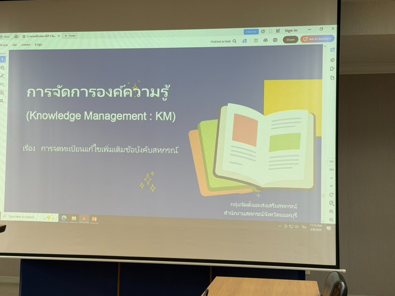 ในการประชุมข้าราชการ พนักงานราชการ และลูกจ้าง สำนักงานสหกรณ์จังหวัดนนทบุรี ครั้งที่ 3/2569 เพื่อมอบนโยบายในการปฏิบัติงานและการเบิกจ่ายงบประมาณในปีงบประมาณ พ.ศ. 2569 พร้อมทั้งติดตามผลการปฏิบัติงานในเดือนที่ผ่านมาและวางแผนการปฏิบัติงานและกิจกรรมต่างๆ ที่จะมีขึ้นในเดือนมีนาคม 2569 ในการจัดประชุมครั้งนี้ จัดให้มีการนำเสนอการจัดทำคู่มือ KM เรื่อง การจดทะเบียนแก้ไขข้อบังคับสหกรณ์ จัดทำโดยนางสาวอามิตา ซอสูงเนิน นักวิชาการสหกรณ์ชำนาญการ กลุ่มจัดตั้งและส่งเสริมสหกรณ์ ซึ่งได้มีการแลกเปลี่ยนเรียนรู้ระหว่างกลุ่มงานและกลุ่มส่งเสริมสหกรณ์ในประเด็นต่าง ๆ เพื่อนำความรู้ที่ได้ไปปรับใช้กับการแนะนำส่งเสริมสหกรณ์ต่าง ๆ และตอบข้อสักถามของสหกรณ์