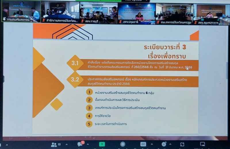 วันพุธที่ 21 มิถุนายน 2566 เวลา 13.00 น. นายรุ่งโรจน์ สรวุฒิพิบูลย์ สหกรณ์จังหวัดนนทบุรี ในฐานะคณะกรรมการคัดเลือก คณะที่ 1.2 และคณะ เข้าร่วมประชุมเพื่อคัดเลือกสำนักงานสหกรณ์จังหวัด กลุ่มที่ 1 (มีบริเวณสำนักงาน) ตามโครงการเสริมสร้างสมดุลชีวิตคนทำงาน ประจำปี 2566 ซึ่งมีหน่วยงานที่เข้าร่วมการคัดเลือกมีจำนวน 6 หน่วยงาน ผ่านระบบ Zoom Meeting โดยมี นายณัฐพล แป้นนอก ผู้ตรวจราชการกรมส่งเสริมสหกรณ์ เป็นประธานการประชุม ณ ห้องประชุมสำนักงานสหกรณ์จังหวัดนนทบุรี ชั้น 4 ศาลากลางจังหวัดนนทบุรี อ.เมืองนนทบุรี จ.นนทบุรี