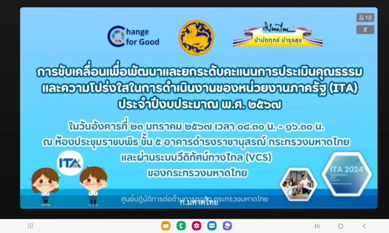 เข้าร่วมรับฟังโครงการขับเคลื่อนภารกิจด้านการส่งเสริมคุณธรรม จริยธรรม และการป้องกันปราบปรามการทุจริตและประพฤติมิชอบของกระทรวงมหาดไทย ประจำปีงบประมาณ พ.ศ. 2567 กิจกรรมที่ 2 การขับเคลื่อนเพื่อพัฒนาและยกระดับคะแนนการประเมินคุณธรรมและความโปร่งใสในการดำเนินงานของหน่วยงานภาครัฐ (ITA) ประจำปีงบประมาณ พ.ศ. 2567 โดยมีวัตถุประสงค์เพื่อให้บุคลากร มีความรู้ ความเข้าใจ และดำเนินการตามแนวทางการประเมินคุณธรรมและความโปร่งใสในการดำเนินงานของหน่วยงานภาครัฐ (ITA) ประจำปีงบประมาณ พ.ศ. 2567 ได้อย่างถูกต้อง