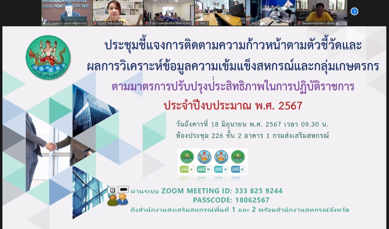 เข้าร่วมการประชุมชี้แจงติดตามความก้าวหน้าตามตัวชี้วัดและผลการวิเคราะห์ข้อมูลความเข้มแข็งสหกรณ์และกลุ่มเกษตรกร ตามมาตรการปรับปรุงประสิทธิภาพในการปฏิบัติราชการ ประจำปีงบประมาณ พ.ศ.2567 (รอบ 6 เดือน) ผ่านระบบ ZOOM Meeting โดยถ่ายทอดสัญญาน จากกรมส่งเสริมสหกรณ์ เทเวศร กรุงเทพฯ โดยมี นายนิรันดร์ มูลธิดา รองอธิบดีกรมส่งเสริมสหกรณ์ เป็นประธานการประชุมฯ