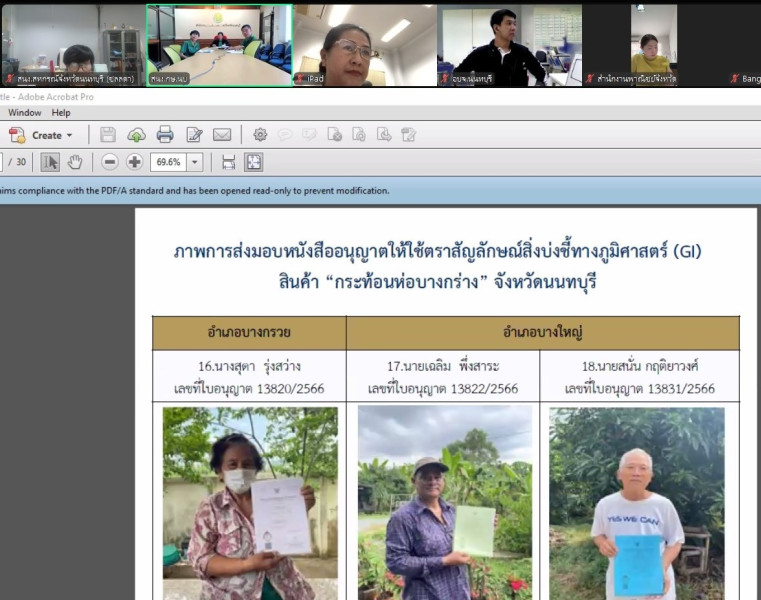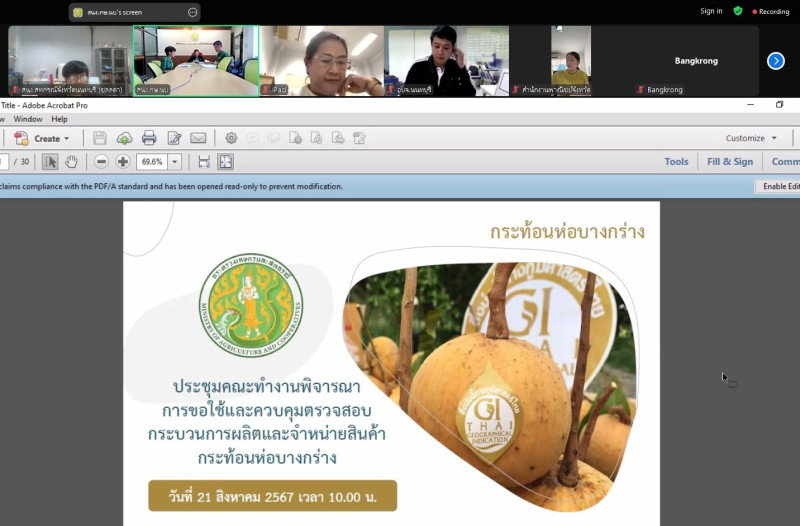 เข้าร่วมประชุมคณะทำงานพิจารณาการขอใช้และควบคุมตรวจสอบกระบวนการผลิตและจำหน่ายสินค้ากระท้อนห่อบางกร่าง ครั้งที่ 1/2567 ผ่านระบบ Application Zoom โดยมีนางสุพิศ พูลคุณานุกูร เกษตรและสหกรณ์จังหวัดนนทบุรี เป็นประธานการประชุม